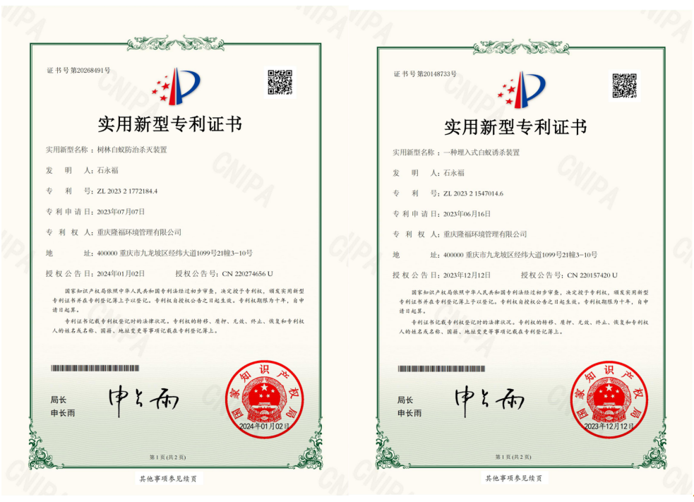 白蟻監(jiān)測控制裝置防治白蟻的原理是將白蟻喜食且對白蟻具有極強引誘力的木塊固定在監(jiān)測控制裝置內,然后將監(jiān)測控制裝置按一定的要求安裝在需保護的房屋、樹木周圍或堤壩內、外坡及坡頂土壤中,外出覓食的工蟻到達監(jiān)測控制裝置周圍一定距離處的土壤中后,由于受裝置內木塊釋放在土壤中的引誘物質的強烈吸引,迅速將蟻路修筑至監(jiān)測控制裝置,并紛紛進入裝置內取食。